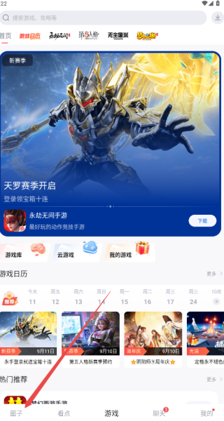 1、在主页,点击左下角的圈子,进入当前游戏的圈子板块;
