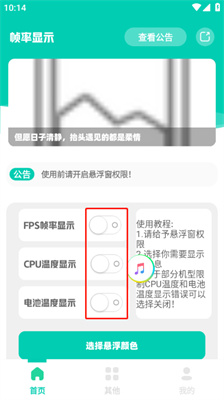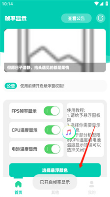2、然后我们进入到软件主页中,大家可以选择打开;fps帧率显示,CPU稳定显示,以及电池温度显示!