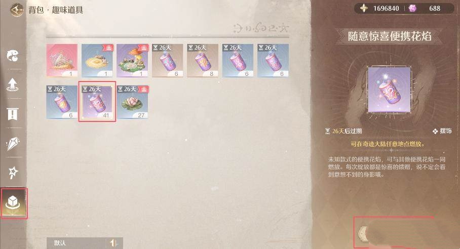 购买完成后,打开游戏背包。背包界面中,找到“趣味道具”分类,随意惊喜便携花焰就在这里。点击该道具,选择“装备”选项。装备成功后,你可以在游戏界面右下角看到道具图标。