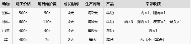 4.牛:牛分为黑白花色等品种,其成长至成年也需要4天左右的时间。成年后的牛,根据品种不同,产奶周期有所差异。比如常见的黑白花奶牛,在第六天开始产奶,之后每2天可以挤一次奶;还有一些其他品种的牛,可能在第八天开始产奶,然后每4天收获一次牛奶。牛奶一直是菜市场中销量可观的商品。养殖牛时,每天给牛喂食草桶里的草料必不可少,还要为牛提供宽敞舒适的牛棚环境。与羊类似,牛棚也要定期打扫,预防疾病。当你有屠宰需求时,同样可以用刀具宰杀牛,获取牛肉用于销售。
