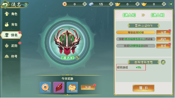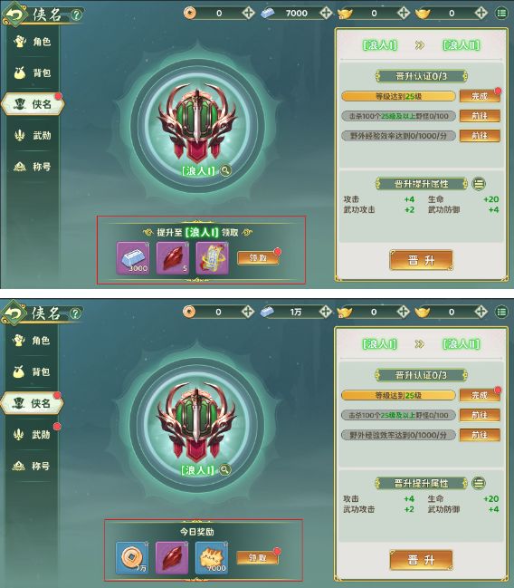 - 除了晋升奖励外,我们每天还可以根据当前的侠名等级领取专属的每日奖励,持续提升角色能力。