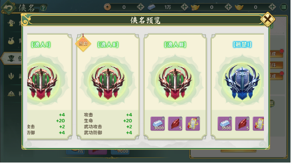- 晋升侠名等级会直接为角色提供属性加成,包括但不限于攻击力、防御力等关键属性。