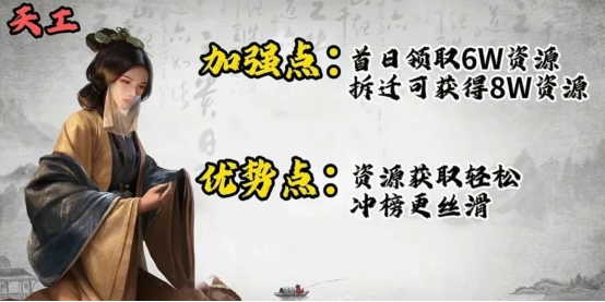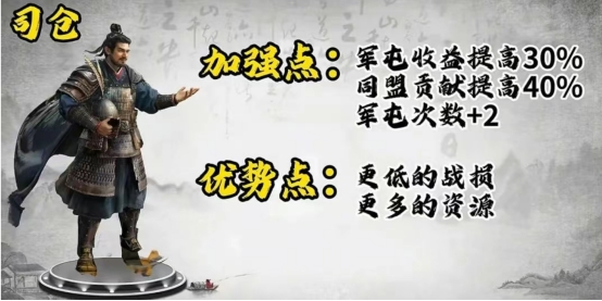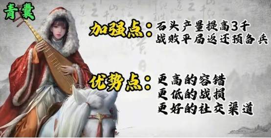 推荐理由:资源获取能力强,可通过军屯、屯垦提升开发地等级,兴建粮仓增加资源产量,辎重营能为盟友提供补给。适合高战玩家开局,也可通过转职体验其他职业。