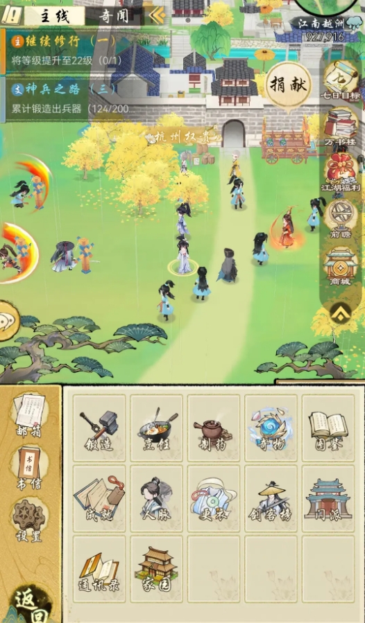 1.玩家初入游戏江湖后,便能解锁烹饪功能。具体操作十分便捷,只需点击主界面右下方的箭头,在弹出的选项中找到“烹饪”并点击,即可唤出烹饪所使用的火炉,进入烹饪玩法界面。
