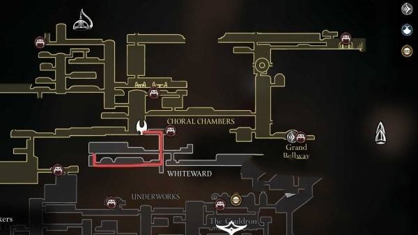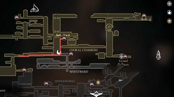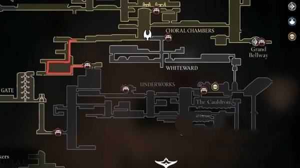 3.离开房间后,继续向上行进,从右侧路线一直往东走,直至来到一个可以攀爬的垂直房间。在此房间内,先向上攀爬,接着向左移动,当看到长椅标志后,前往上层房间,花费念珠激活长椅。激活后的长椅可作为玩家的复活点和休息点,方便在后续探索中死亡后能快速回到此处。