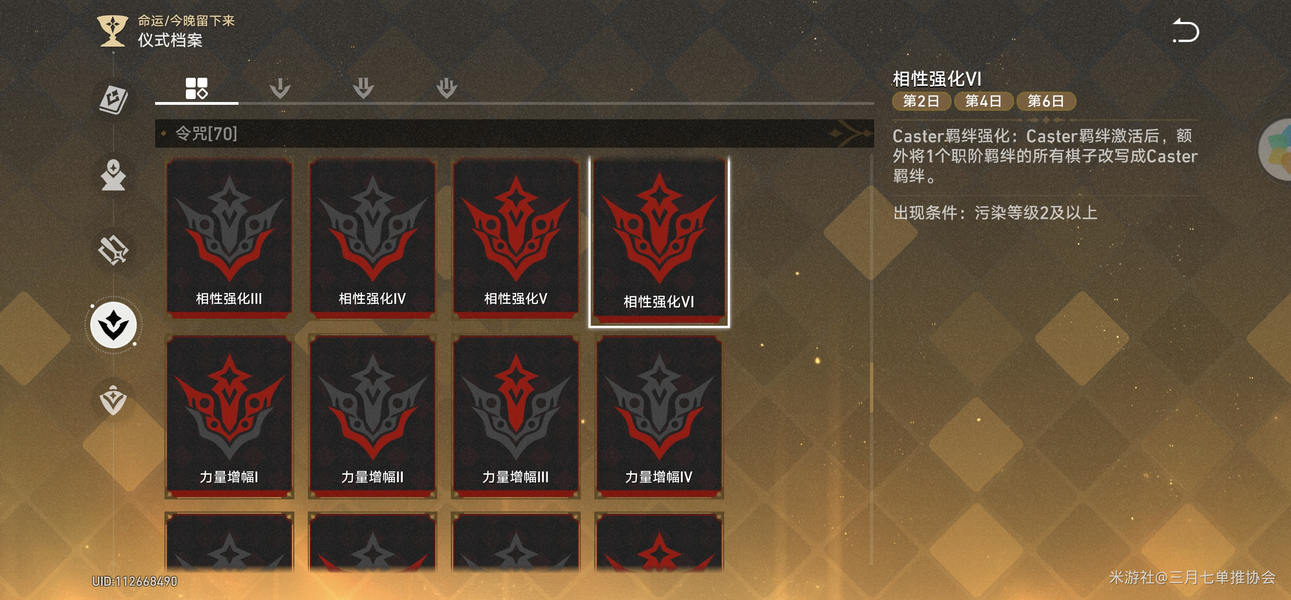 3.宝具/礼装能为整局战争提供增益,像强化特定职阶伤害等。令咒则提供特殊效果,用于调控商店,如“必出4阶Lancer棋子”等,是凑羁绊和升星的关键道具。