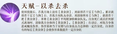 1.如鸢安期的核心竞争力源于独特的技能体系。天赋“以杀去杀”通过积累“刍狗”层数转化为“黄金剑”,为队友提供群体触发伤害与攻击系数加成,但自身离场会清除所有“黄金剑”,形成攻防一体的战术牵制。