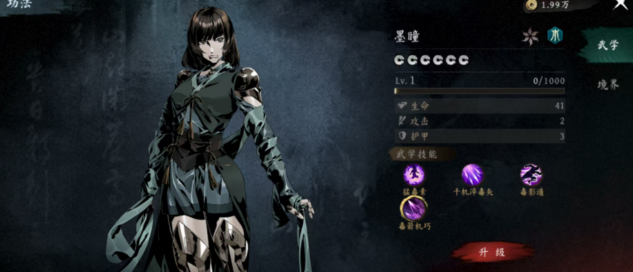 - 千机淬毒矢:消耗30内力值释放9枚毒箭,每发造成40%攻击力的水属性伤害并附加1层中毒效果,冷却时间10秒。