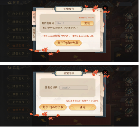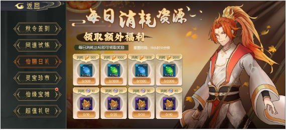 - 仙赐日礼:每日消耗灵髓和天命石,领取神晶和枫金叶,灵髓消耗方式多样。