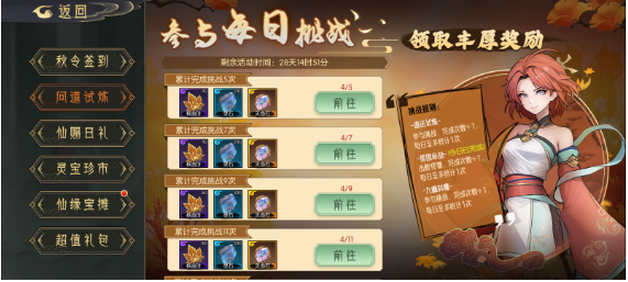 - 问道试炼:每日完成道法、命劫、九幽各一次,累计任务点数(每天最多3点,任务需要30点,总体难度不大)。