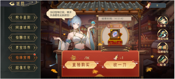 - 仙缘宝摊:每日开启一次宝箱,宝箱内容每日更新,可使用灵刃符砍价直至免费。