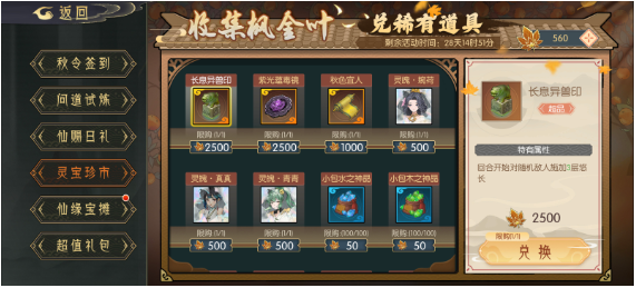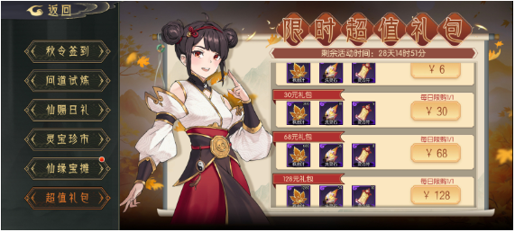 - 超值礼包:每日氪金礼包,包含枫金叶、洗灵石等,奖励一般,但洗灵石较多。