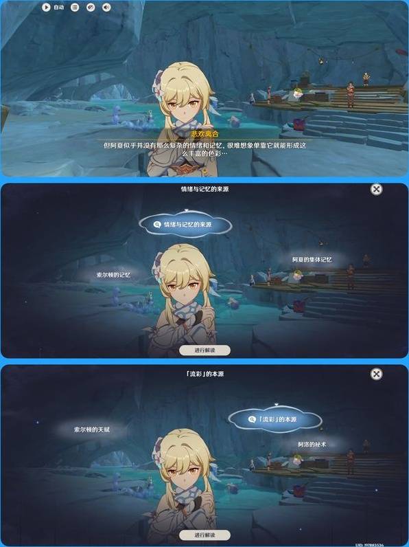 13.根据找到的线索进行推理,推理选项依次为:阿尔沃的分析+索尔顿的表现——>提交“色彩与索尔顿的关系”——>提交“情绪与记忆的来源”——>提交“缺少记忆”——>索尔顿的天赋+阿洛的秘术——>提交“流彩的本源”。