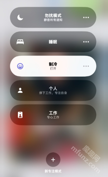 下滑控制中心→ 长按「专注模式」→ 选择「制冷」图标即可一键开关