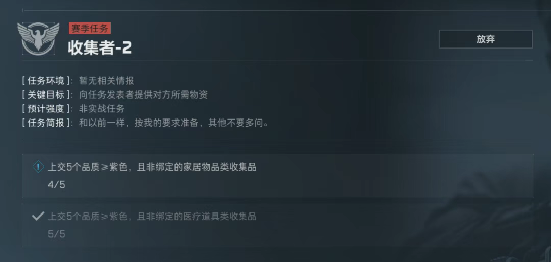 上交5个品质大于等于紫色的非绑定医疗道具类收藏品