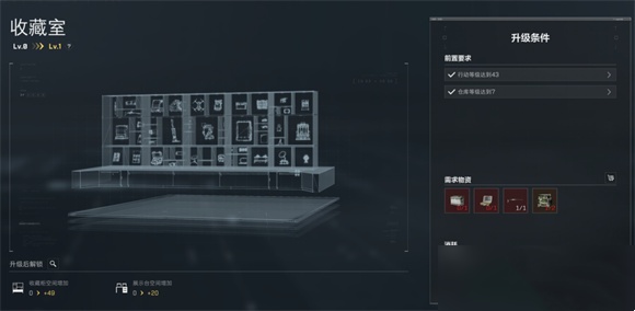 升级效果为收藏柜空间增加49,展示台空间增加20。这为玩家提供了更多展示珍贵藏品的空间,方便整理和陈列从局内搜集到的各类物品。