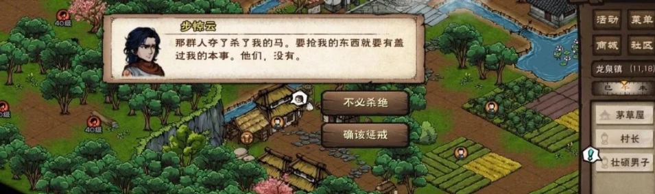 3.等待2分钟,原地对话壮硕男子选择「确该惩戒」,去(13,18)对话时云触发剧情战,然后去(12,18)对话步惊云。