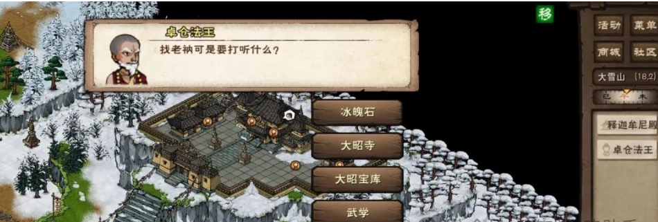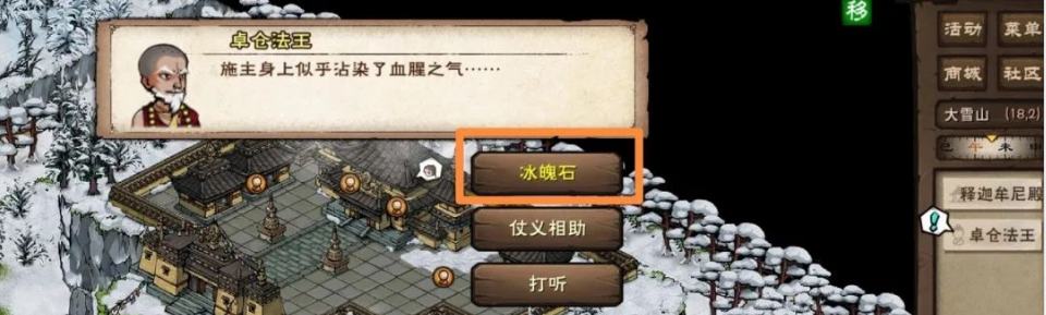 4.向卓仓法王(18,2)打听「冰魄石」,获得「法王信物」,将其给予大勇禅师(6,28),来到【佛牢】。
