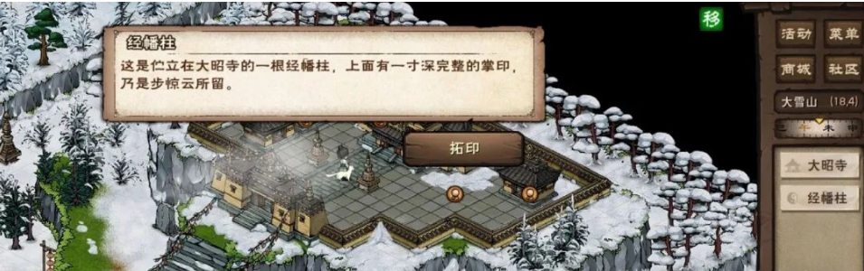7.消耗1文房四宝,在(18,4)经幡柱处拓印,获得上乘拳法【排云掌谱】。(需要50级)