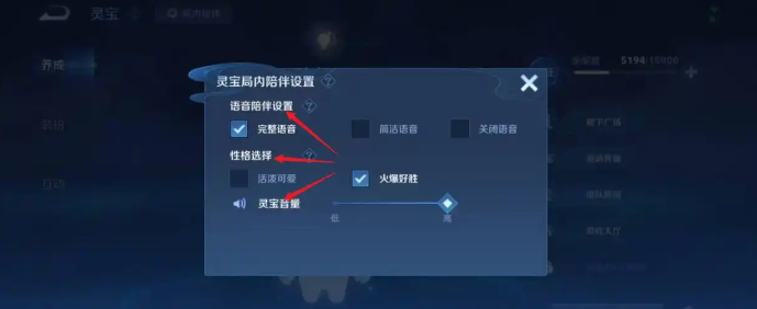 3、在灵宝局内陪伴设置页面,勾选“语音陪伴设置”、“性格选择”、“灵宝音量”即可。