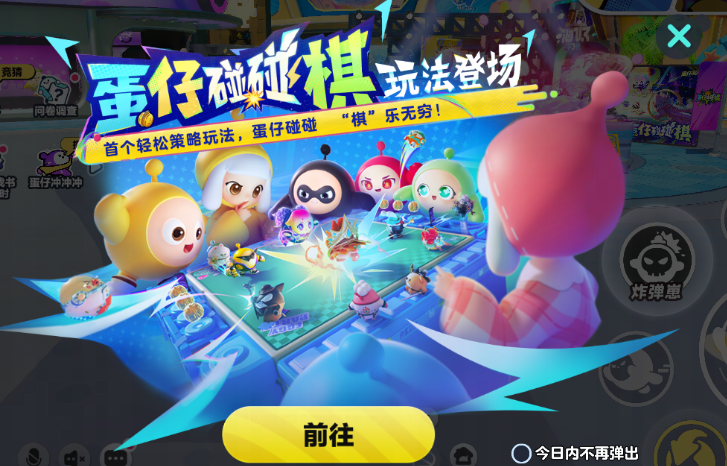 活动内容:<蛋仔碰碰棋>策略玩法正式上线,玩家通过移动蛋仔、碰撞和道具组合进行策略对战,支持多人组队或匹配,强调地形利用和临场应变能力。