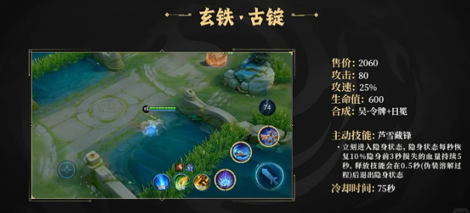 主动技能:芦雪藏锋,立刻进入隐身状态,隐身状态每秒恢复10%隐身前3秒损失的血量持续5秒,释放技能会在0.5秒后退出隐身状态,冷却时间75秒。