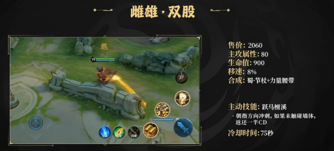 主动技能:跃马檀溪,朝指方向冲刺,如果未触碰墙体,返还一半cd,冷却时间75秒。