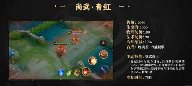 主动技能:魏武虎士,标记目标为死斗目标,自身获得衰减的25%~50%加速效果,自身对非死斗目标的伤害降低25%,受到非死斗目标的伤害降低25%,持续5秒,冷却时间75秒。