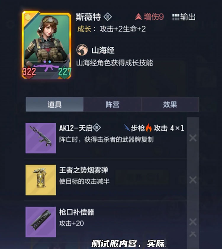 角色搭配:角色分为坦克、输出、辅助三种类型,且具有不同阵营,如保卫者、幽灵、山海经女团、铠甲勇士等。合理搭配阵营,能触发阵营羁绊效果,获得攻击、防御等方面的加成。玩家最多可放置6张角色卡牌上阵,每个角色默认可装备1把主武器、1个投掷道具、2个辅助道具,可根据角色特点和阵营羁绊来构建阵容。