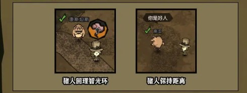 4.理智恢复:靠近友好状态下的猪人,玩家能够获得理智值的恢复,每靠近一分钟,大约可恢复25点理智值。不过,当玩家靠近时,猪人通常会选择躲开。为解决这一问题,玩家可以巧妙地将猪人卡在角落里,这样既能保持靠近猪人的状态,又能持续获得理智值的恢复。在黄昏及洞穴内,由于光线较暗,猪人会感到害怕。但如果给猪人戴上矿工帽,它不仅自身不再害怕黑暗,还能为附近的其他猪人提供照明,帮助它们克服对黑暗的恐惧。