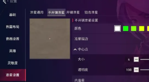 准星设置页面,可以对准星的颜色、透明度、轮廓厚度等参数进行调整。比如为了不遮挡视野,可适当降低透明度;新手玩家可以把准星从原来的原点调整成十字,提高瞄准精度。