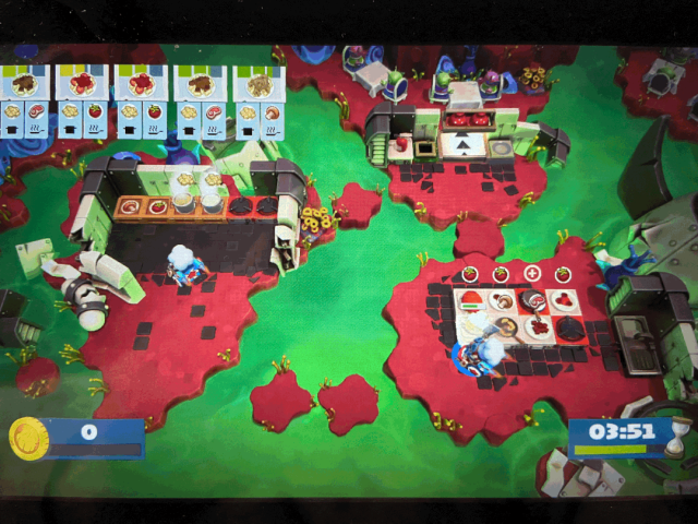 该主题下的菜品大多还是以快餐为主,但是汉堡中加了不少东西像生菜和芝士这种,玩家需要配合的情况下通过任意门转换到另一个场景,比如传菜和切菜之间没有台阶只能进门。开心的一点是这一关卡因为形式比较新可以不用刷碗!