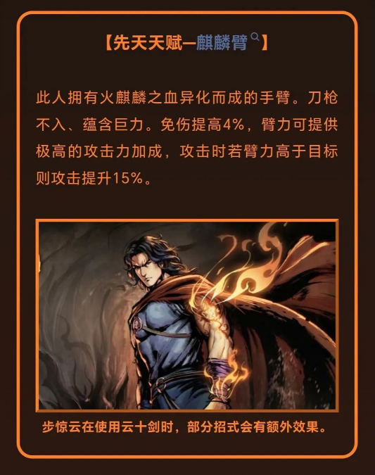 麒麟臂 效果是自带4%免伤,每一点臂力增加5.5攻击力(溢出会削减),臂力在高于攻击目标时会提高自身15%的攻击。