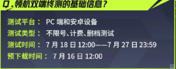 本次测试为不限量删档计费测试,测试时间为7月18日中午12点至7月27日晚上23点59分。