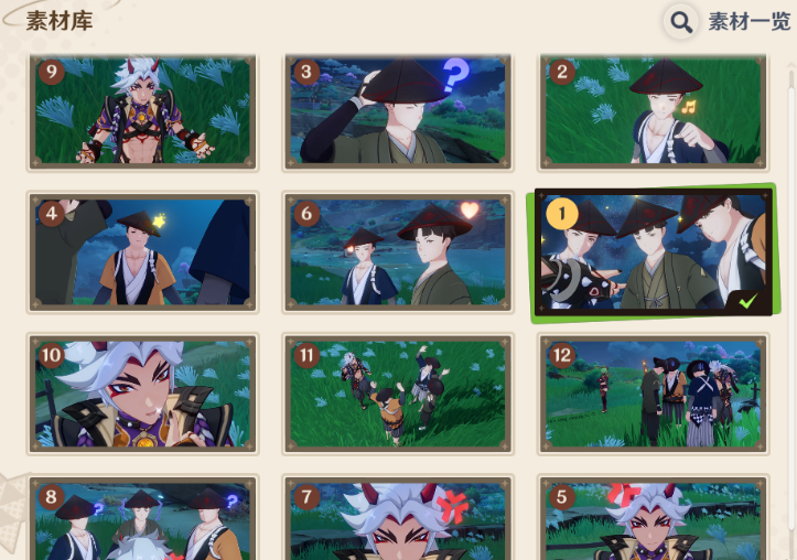 原神剪影辑帧第三关的内容以荒泷派发放零花钱的事件为引子,引出七圣召唤的宣传词,最后以久岐忍的花絮作为结尾,形成了一则精彩的七圣召唤宣传广告。共有12个镜头,需要大家根据脚本依次将素材内容摆放好。