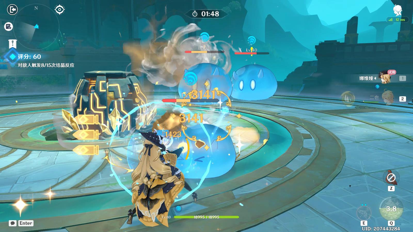 6.第二轮:钟离先长按战技生成护盾,然后切娜维娅上场输出。夜兰和芙宁娜可以在合适的时候释放技能辅助。在护盾庇护下,娜维娅全力输出击败敌人。注意拾取结晶反应产生的结晶盾,这样能更快速地完成“处于护盾庇护下时击败6名敌人”的剑舞目标。