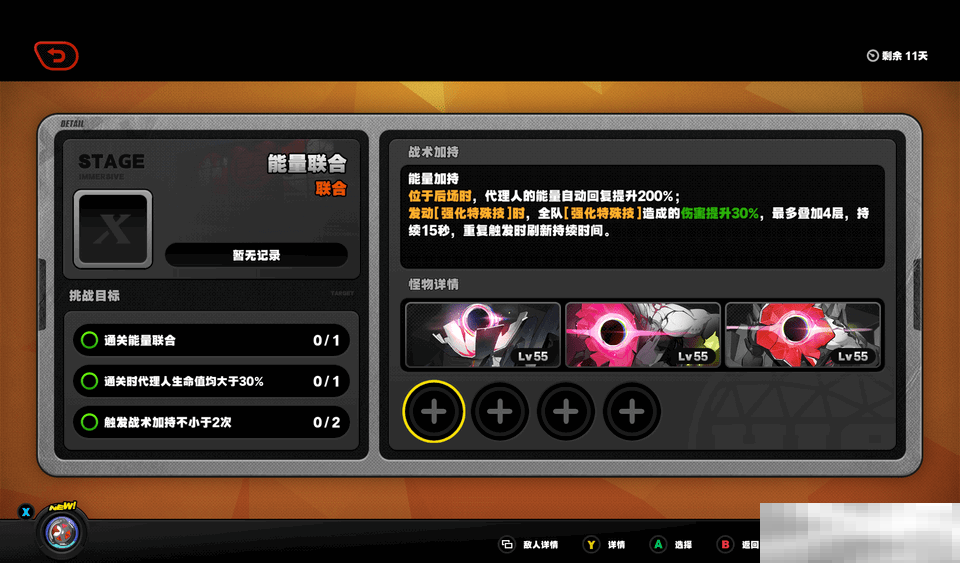 1.能量加持:当代理人处于后场时,能量回复速度会大幅提升,达到200%。并且,每当使用强化特殊技,全队的强化特殊技伤害就会提升30%,这个效果最多能叠加4层,持续15秒。每次重复触发还能刷新持续时间。所以,在战斗中要留意强化特殊技的释放时机,以此来最大化输出。