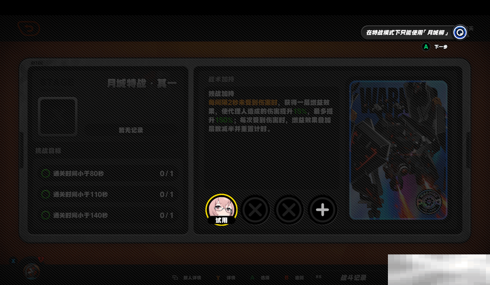 3.特战模式-独战加持:此关属于月城特战,只能使用月城柳。在特战模式下,每间隔2秒未受到伤害,月城柳就能获得一层增益效果,伤害提升15%,最多可提升至150%。但一旦受到伤害,增益层数就会减半并重置计时。所以战斗时要时刻注意躲避敌人攻击,保持增益层数。