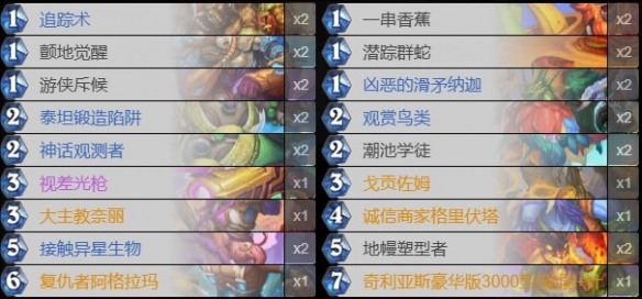 2.发现猎:以猎人的发现机制为核心,像大主教奈丽和诚信商家格里伏塔这样的卡牌,不仅在发现猎中作用巨大,还能在其他猎人卡组中发挥价值,是具有较高通用性的卡牌。这套牌通常节奏较快,通过不断发现优质卡牌来打出爆发伤害。