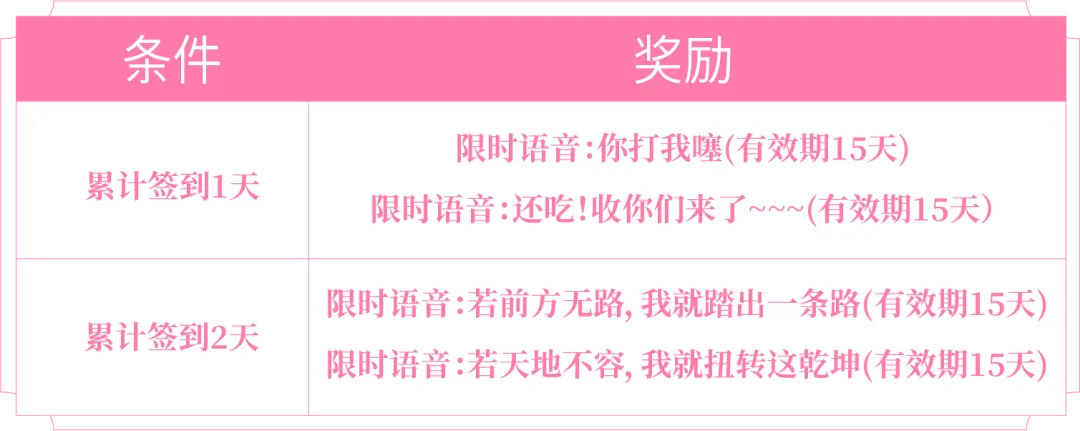 累计签到2天:能额外领取限时语音“若前方无路,我就踏出一条路”和“若天地不容,我就扭转这乾坤”,有效期同样为15天