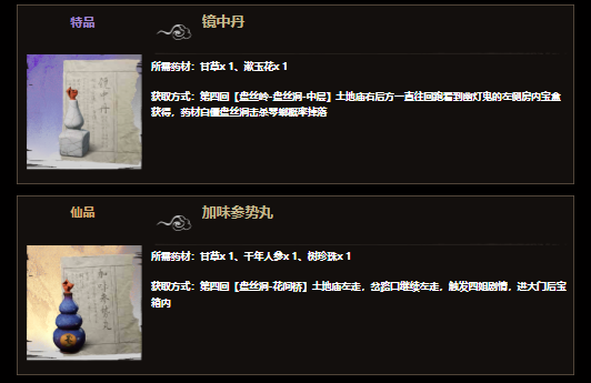 获取方式:于盘丝洞-花间桥,附近的大喜灯笼房间内,开箱获得丹方和丹药。