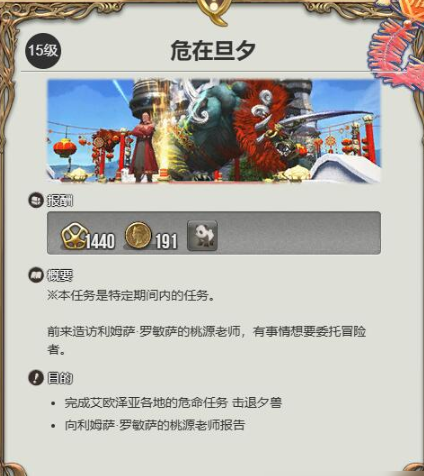 1.在特定活动期间,玩家等级达到15级后,前往利姆萨?罗敏萨上层甲板。具体坐标为(11.4,13.6),在这里找到名为【桃源老师】的NPC,与之对话并接取任务【危在旦夕】。这个任务有着一定的剧情和挑战,不过难度不算太高,对于15级的角色来说,只要熟悉游戏基本操作,按照任务指引,与怪物战斗、收集物品等都能顺利完成。当你成功完成【危在旦夕】任务后,就能将宠物【熊猫宝宝】收入囊中。