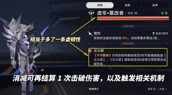 善盈后福,德气流布:虚韧性削弱,忘归人在场时,敌方目标初始拥有自身韧性上限50%的虚韧性。处于弱点击破状态的敌方目标受到攻击后,将本次攻击的削韧值转化为1次100%的超击破伤害。