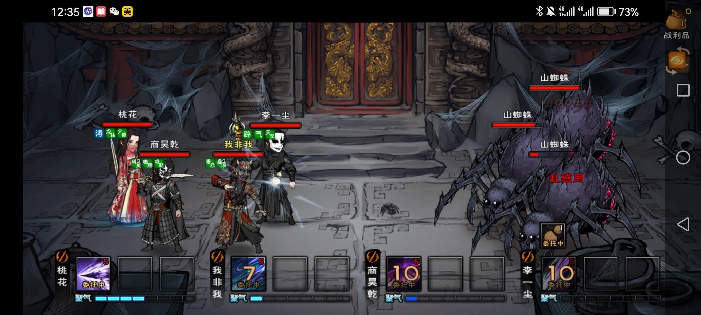 进入主殿后,立即迎战蜘蛛。蜘蛛会在一回合后进入狂暴状态,攻击力和防御力大幅提升。建议优先集中火力消灭一只,避免被群体攻击。