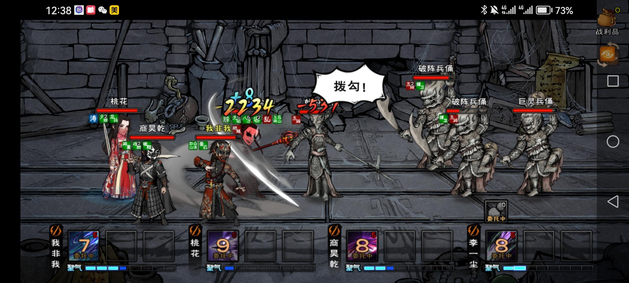 继续前进,下一场战斗是面对戟兵。戟兵攻击范围广,横扫技能覆盖左前右前三个位置。利用破阵兵俑抵挡伤害,并注意触发提升防御的机制。