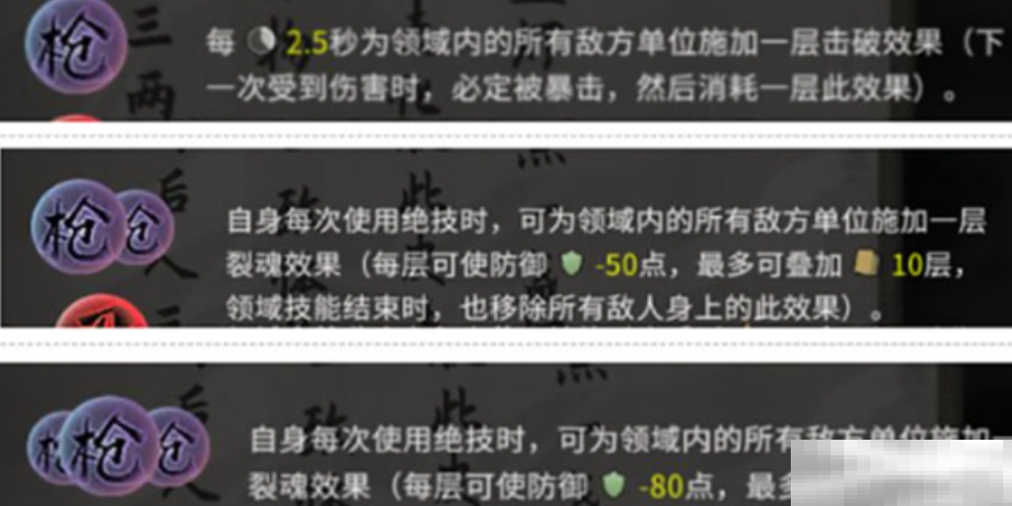2.枪领域:释放绝技时,领域内所有敌人将被施加裂魂效果,每次减防80,最多叠加10层,削弱敌方的防御力。