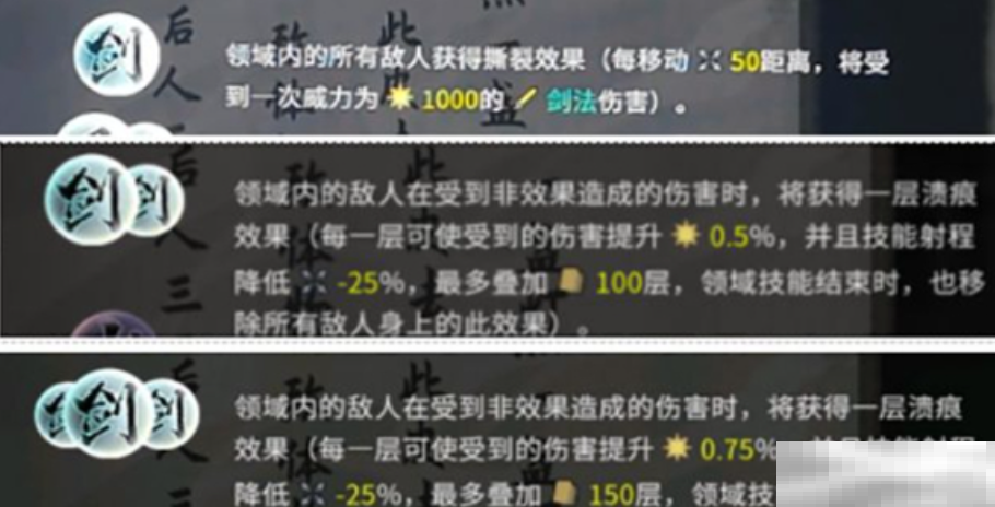 1.剑领域:敌人如在领域内遭受伤害,将逐渐累积溃痕效果,每层提升伤害承受0.75%,同时降低技能射程25%,最多叠加至150层,让敌人陷入困境。