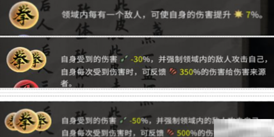 5.拳领域:减少50%所受伤害,强制吸引敌人攻击,并反弹500%的伤害,展现强大的防御和反击能力。
