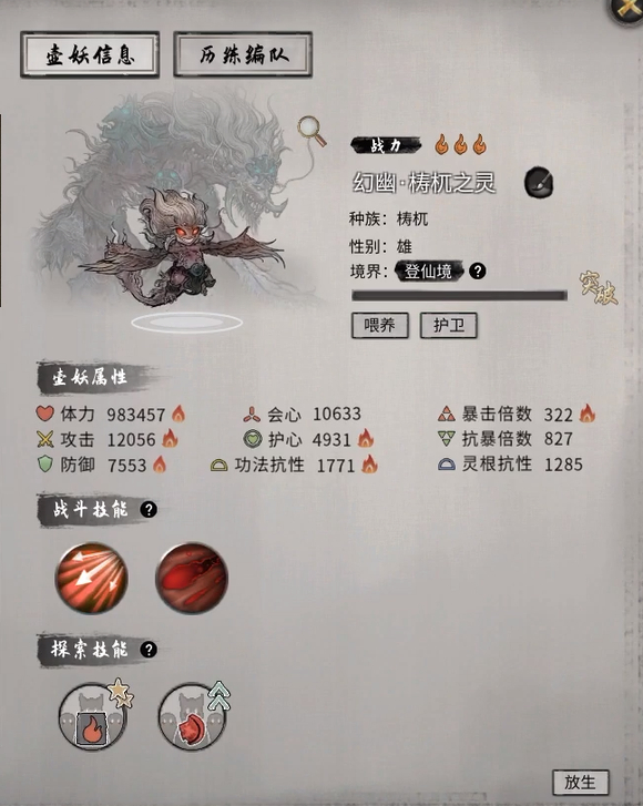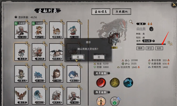 2.派遣壶妖外出历练,结束后可获得丰富道具奖励。让驯服的妖兽去历练,有机会在探索技能处获得“化形之术”。注意,妖兽的探索技能有限,建议提前备份存档,循环尝试直至获得化形之术。化形前存档,因为化形外貌可SL。妖兽性别决定化形后性别。