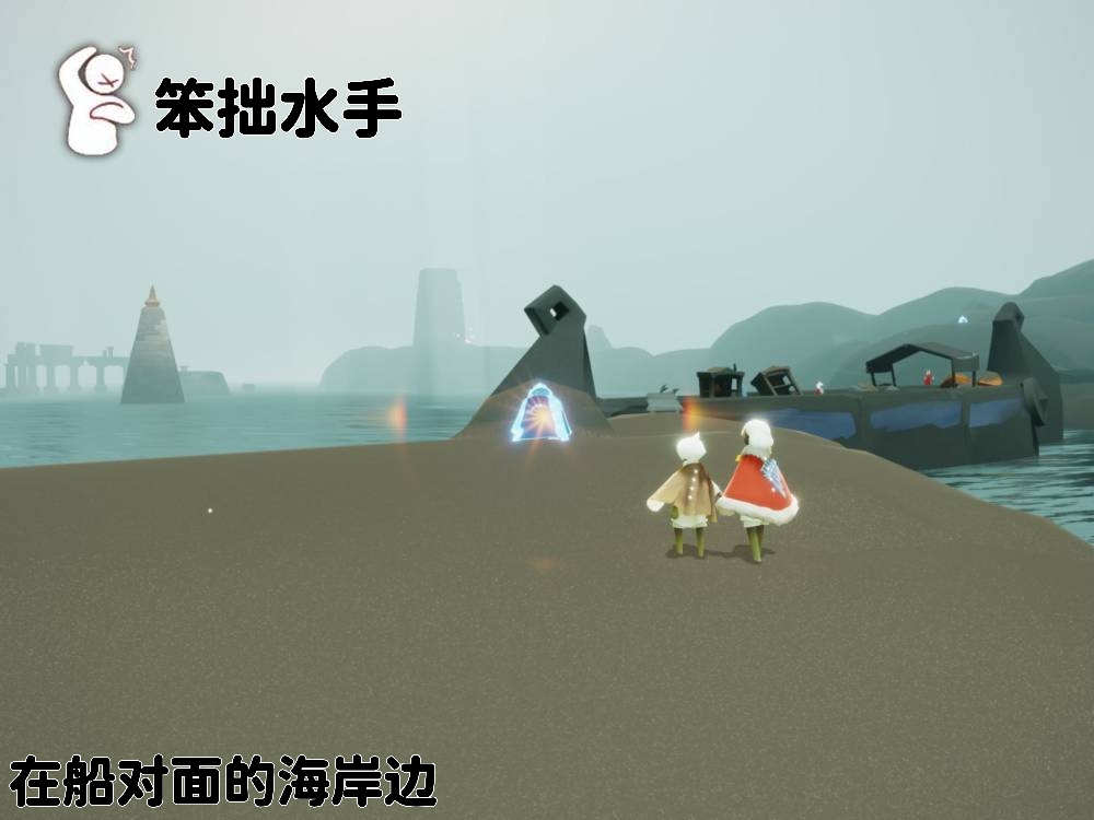 笨拙水手:位于船对面海岸边。你需要点燃先祖后跟随其往船上面、海岸边、海边后面、破船那边走,最后返回船上面触碰任务。